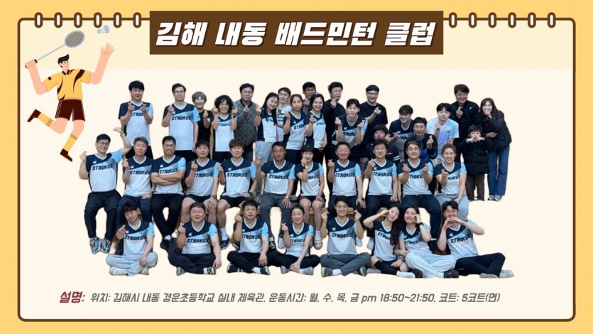 저희 내동클럽은 내동에 위치한 경운초등학교 실내체육관에서 운동을 하고 있습니다. 배드민턴을 함께하고자 하는 여러분 모두를 저희 클럽으로 모시고자 합니다. 저희 내동클럽은 언제든지 여러분을 환영합니다. ▶ 클럽연혁 2006년 12월 27일 내동배드민턴클럽 발기 / 한행규회장외 36명 내동중학교 체육관에서 출발 2007년 5월 20일 내동배드민턴클럽 창립 / 초대 한행규 회장 취임(2007~2008년) 2008년 6월 내동중학교에서 내동초등학교 체육관 이전 2009년 2대 이예식 회장 취임(2009~2010년) 2010년 12월 김해시연합회장기 배드민턴대회 종합 2위, 단체전 3위 2011년 3대 김중식 회장 취임 2011년 4월 김해시연합회장기대회 종합 우승 2011년 12월 김해시연합회장배 배드민턴대회 종합 3위, 단체전 우승 2012년 4대 설창호 회장 취임 2012년 3월 경상남도연합회장기대회 종합 2위 2013년 5대 김현석 회장 취임 2013년 12월 김해시연합회장기 배드민턴대회 종합 3위, 단체전 우승 2014년 6대 이상균 회장 취임 2014년 12월 김해시연합회장기 배드민턴대회 종합 2위, 단체전 우승 2015년 7대 손종모 회장 취임 2015년 10월 김해시연합회장기 배드민턴대회 종합 우승 2016년 8대 신상태 회장 취임 2016년 10월 김해시장기 배드민턴대회 종합 우승 2017년 9대 강성우 회장 취임 2017년 10월 내동초등학교에서 경운초등학교 체육관 이전 2017년 10월 김해시장기 배드민턴대회 종합 3위 2018년 10대 안강진 회장 취임 2018년 8월 김해사랑 미라셀배대회 종합 우승 2018년 12월 김해시협회장기 배드민턴대회 종합3위,단체전 3위 2019년 11대 이용원 회장 취임 2019년 3월 김해협회장기 종합 준우승 2019년 4월 이좋은치과배 종합 준우승 2019년 6월 김해복음병원배 종합 준우승 2019년 12월 김해시협회장기 배드민턴대회 종합3위, 단체전 우승 2020년 12대 최성진 회장 취임,2023년 제13대 이용구 회장 취임, 2023년 제25회 김해시장기 배드민턴대회 종합우승, 2023년 클럽대항전 준우승, 2023년 김해협회장기 배드민턴대회 종합우승 ▶ 홈페이지 : https://band.us/band/3215140 / http://cafe.daum.net/naedong226